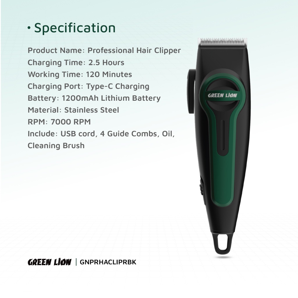 Achieve the quality of and hairstylist quality grooming at your home with the Green Lion Professional Hair Clipper. This comprehensive grooming tool includes a USB cord, 4 size combs, oil, and a cleaning brush for your convenience. A long lasting 1200mAh battery gives you up to 120 minutes of uninterrupted cordless use, and the 2.5h charging time (through Type-C Port) ensures your clipper is always ready when you need it. With a rotational speed of 7000 RPM and stainless steel blades, experience precise and efficient haircuts every time. Your grooming routine will be much more comfortable and efficient with the Green Lion Professional Hair Clipper.