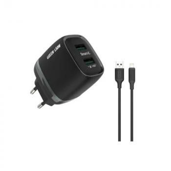 The Green Lion Dual USB 12W Wall Charger with a 1-meter USB-A to USB-C cable offers fast, efficient charging for your devices. Featuring two USB-A ports, each delivering 5V-2.4A output, it can charge two devices simultaneously. Its total 12W power output ensures quick charging for smartphones, tablets, and other USB-powered gadgets. Designed with a sleek black EU plug, the charger comes with a durable PVC cable for reliable daily use. Equipped with multi-protection safety features—including over-current, short circuit, and over-temperature protection—it guarantees safe charging wherever you go. Perfect for home, office, or travel.