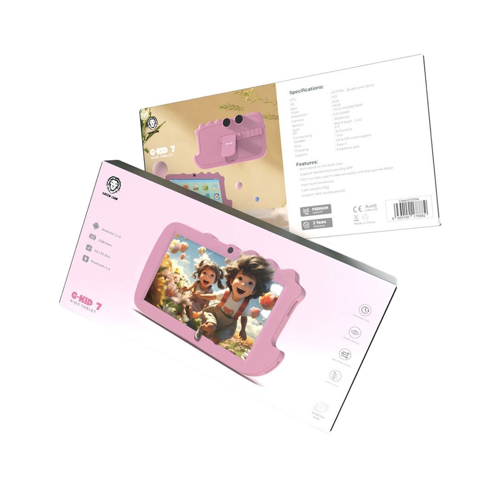 The Green Lion G-Kid 7 Kids Tablet is designed to provide a balanced combination of education and entertainment for young users. Running on Android 11.0 with 2GB of RAM and 16GB of internal storage, it delivers smooth performance for various educational and recreational applications. Connectivity options include Bluetooth 4.0 and 3G LTE SIM support for staying connected on the go. Robust parental control features allow parents to limit screen time, monitor activity, control app access, and filter content, ensuring a safe digital environment. The tablet features a vibrant 7-inch IPS display with a resolution of 1280×800 for clear and engaging visuals. Dual 2.0MP cameras capture moments, while the 3000mAh battery provides long-lasting use. Additional conveniences include a stand on the back, Type-C charging, and support for earphones and the IWAWA Kid Learning App.