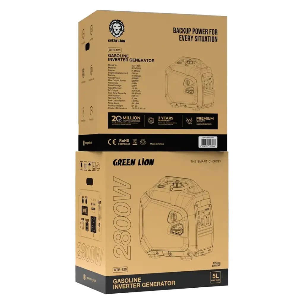 The Green Lion Gasoline Inverter Generator GTR120 ensures a steady and adequate power supply meant for various applications. Powered by a 4-stroke, 120cc displacement engine, it produces a rated power output of 2500W with a frequency of 50Hz. This generator has a petrol fuel tank of 5L capacity to operate continuously for a good 5 hours and an oil capacity of 400mL. Its DC output is 12V/8.3A , which is useful for charging appliances . The noise rating is merely 64 dBA, providing quieter operations best suited for residential and outdoor applications . The ignition of this generator is as simple as a start switch operation, with electric and recoil start choices and a fuel indicator feature . With less than 500g fuel consumption, it is low on energy, hence friendly to the environment . Surely, the GTR120 is a perfect power solution on the go .