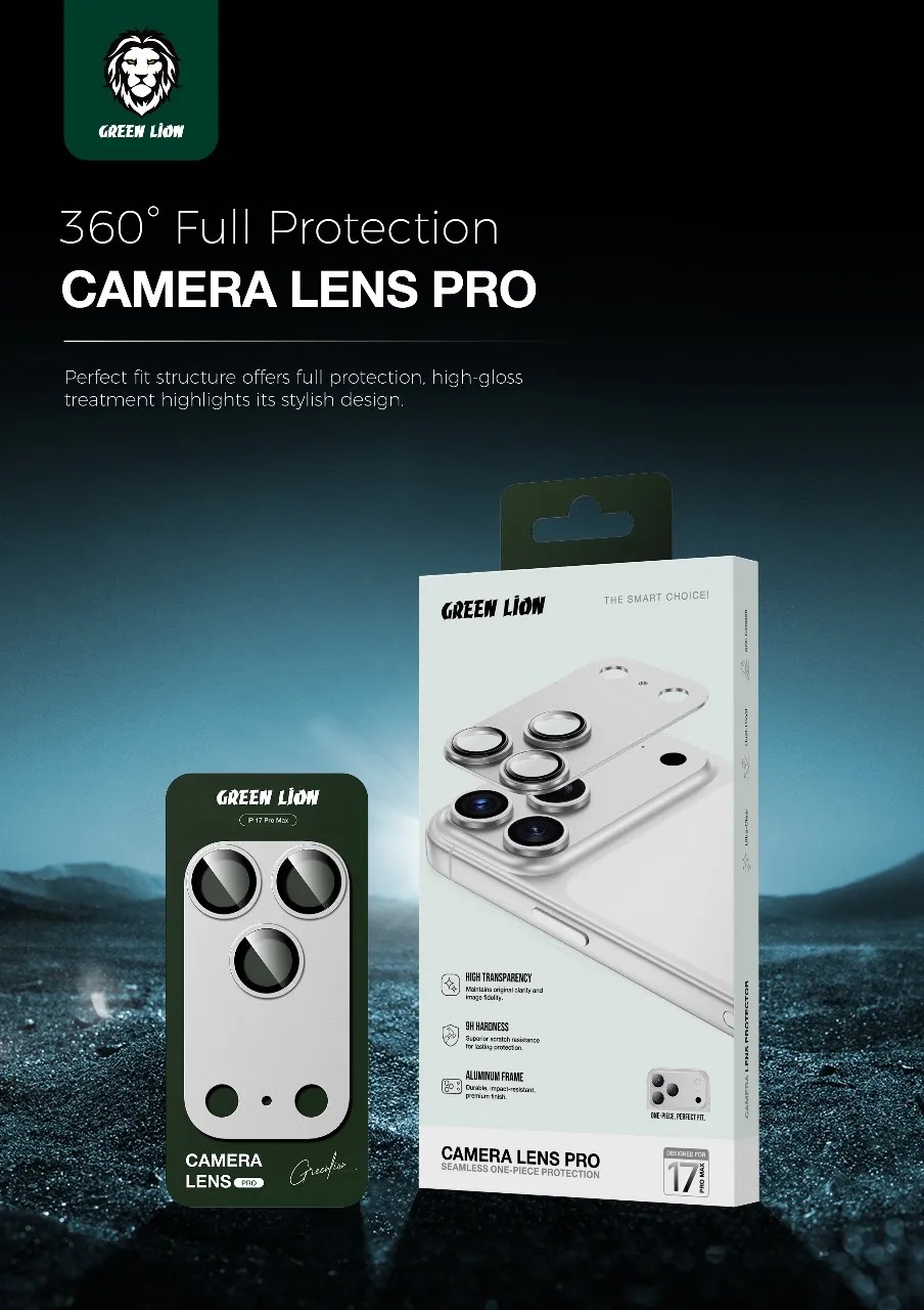 The Green Lion Camera Lens Pro is a premium camera lens protector made specifically for the iPhone 17 Pro Max. Its frame is built from aluminum, giving it durability and a sleek, solid feel. Inside, the lens protector is designed for high optical clarity, allowing your camera to keep sharp, vibrant image quality. It uses nano‑absorption technology to ensure a clean, secure fit, reducing air bubbles or misalignment. The surface is finished with coatings that resist fingerprints and scratches, helping to keep the lens clean under regular use. An installation tray is included to make alignment easier and less stressful. With this protector, you get strong protection without sacrificing style, usability, or photo performance.