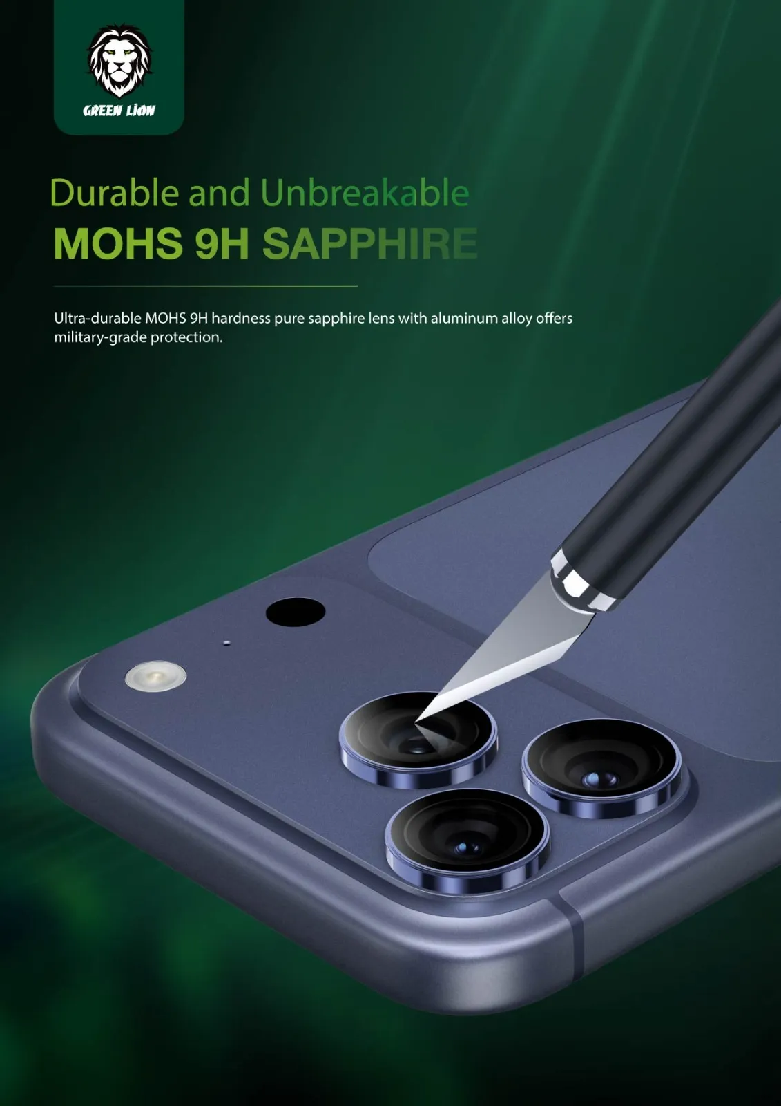 Unmatched in protection and style, the Green Lion Sapphire Camera lens carries a military-grade glossy shield on its guard. Constructed to be strong and unbreakable, it protects the camera from scratches, drops, and impacts, thus preserving the pristine condition of your iPhone camera. Using PVD technology with AR coating, this lens ensures high transparency with a mirror gloss finish that makes the device even more attractive without compromising on function. With such military-grade durability, the lifespan of this lens conforms to any occasion, while the full coverage design protects every inch of the camera area. With PVD technology, this lens exhibits clear and sharp images-you will be able to take vibrant and precise photographs while maintaining clarity! Whether it be for protection or purely cosmetic enhancement, the renowned Green Lion Sapphire Camera Lens is well worth the addition to your iPhone 17 Pro Max in terms of both reliability and beauty.