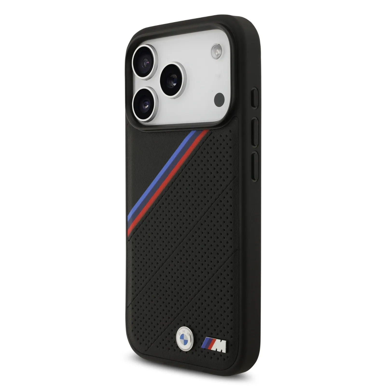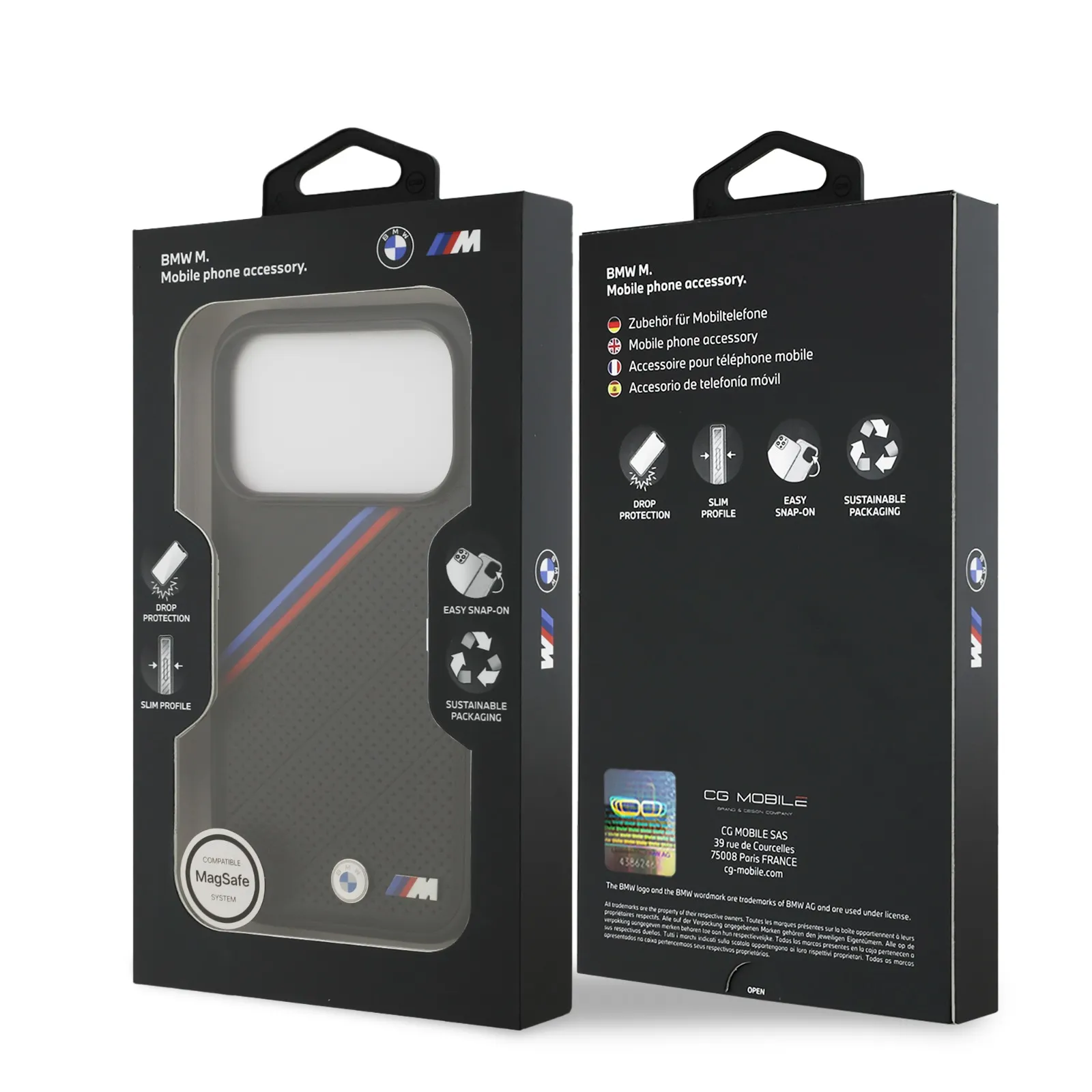 BMW MagSafe PU Leather Case With Tricolor Slanted Stripes & Metal Logos For iPhone