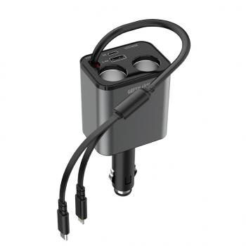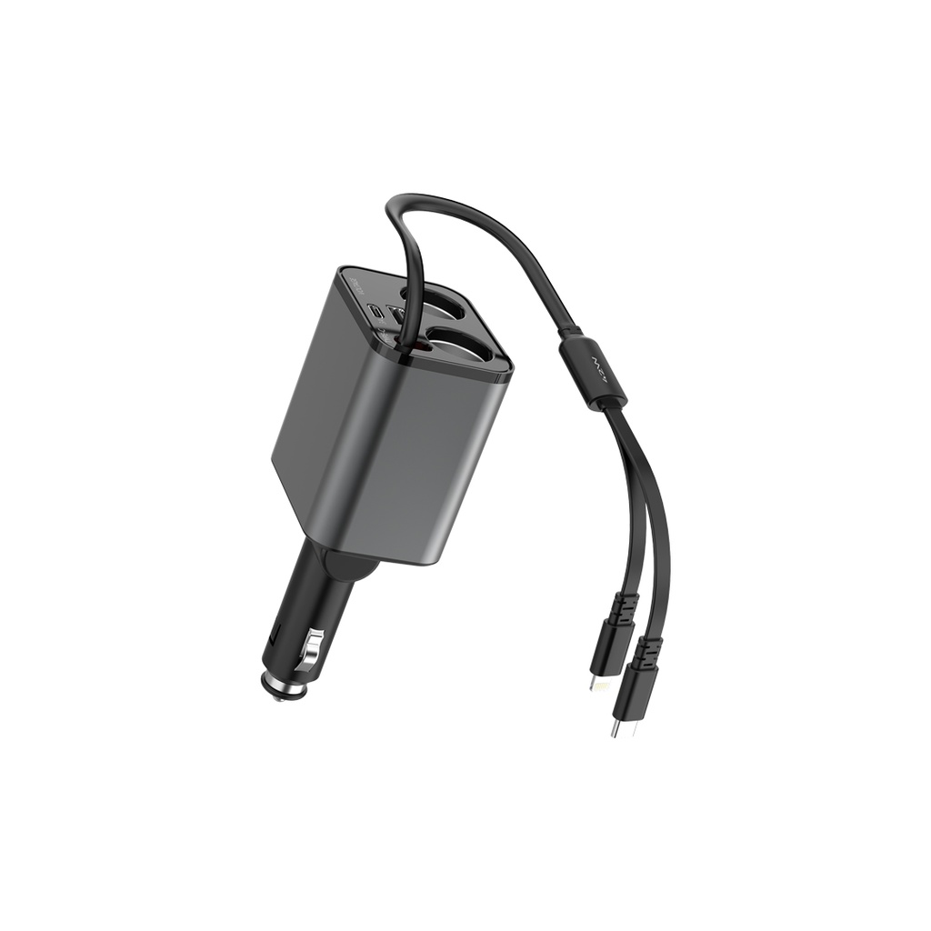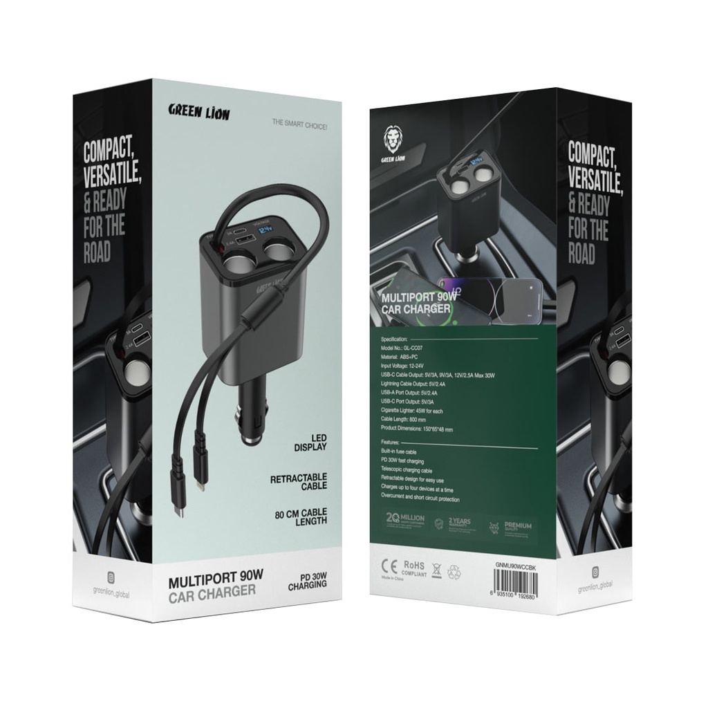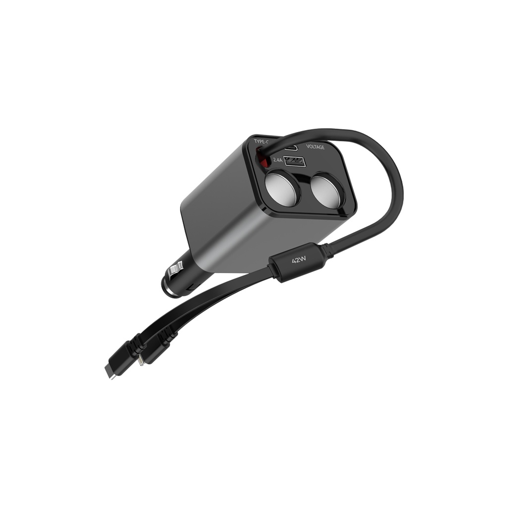 Specifications:📦 Material: ABS + PC🔌 Input Voltage: 12–24V⚡ USB-C Cable Output:▪️ 5V/3A | 9V/3A | 12V/2.5A (🔝 Up to 30W)⚡ Lightning Cable Output: 5V/2.4A⚡ USB-A Port: 5V/2.4A⚡ USB-C Port: 5V/3A🚗 Car Lighter Port: 45W per port📏 Cable Length: 800mm