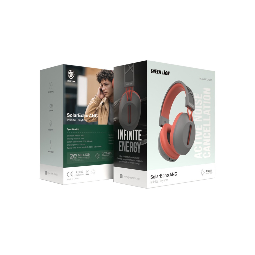Have a great audio experience with the Green Lion SolarEcho ANC Infinite Playtime headphones. These headphones offer an efficient way to enjoy your favorite music, games and podcasts, because of built-in solar cells that continuously keeps charging. Equipped with Bluetooth V5.3 technology, the SolarEcho offers a stable and reliable connection within a 10-meter working distance. The 3.7V 300mAh battery provides power for extended listening sessions, with a charging time of just 2.5 hours. These headphones deliver great sound quality and clarity. The Active Noise Cancelation technology reduces ambient noise by up to -22db, offering an uninterrupted audio experience .The Green Lion SolarEcho headphones provide a balanced soundscape for all types of music and sounds. Enjoy up to 20 hours of talking time with ANC enabled, or extend it to 30 hours with ANC turned off.